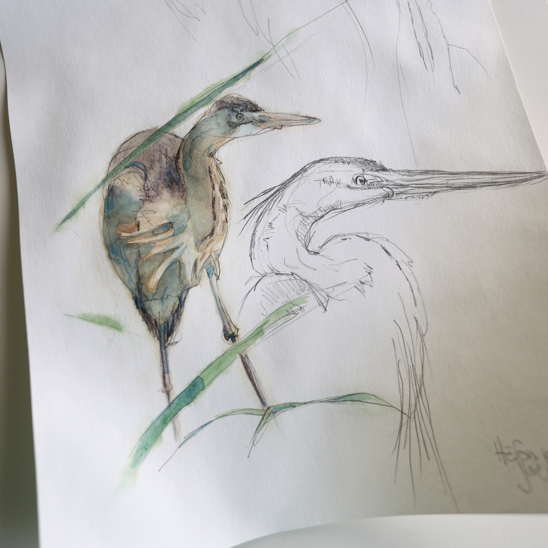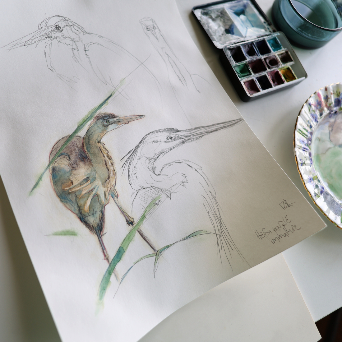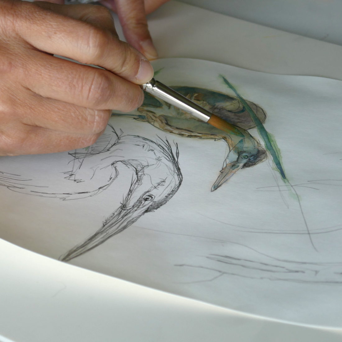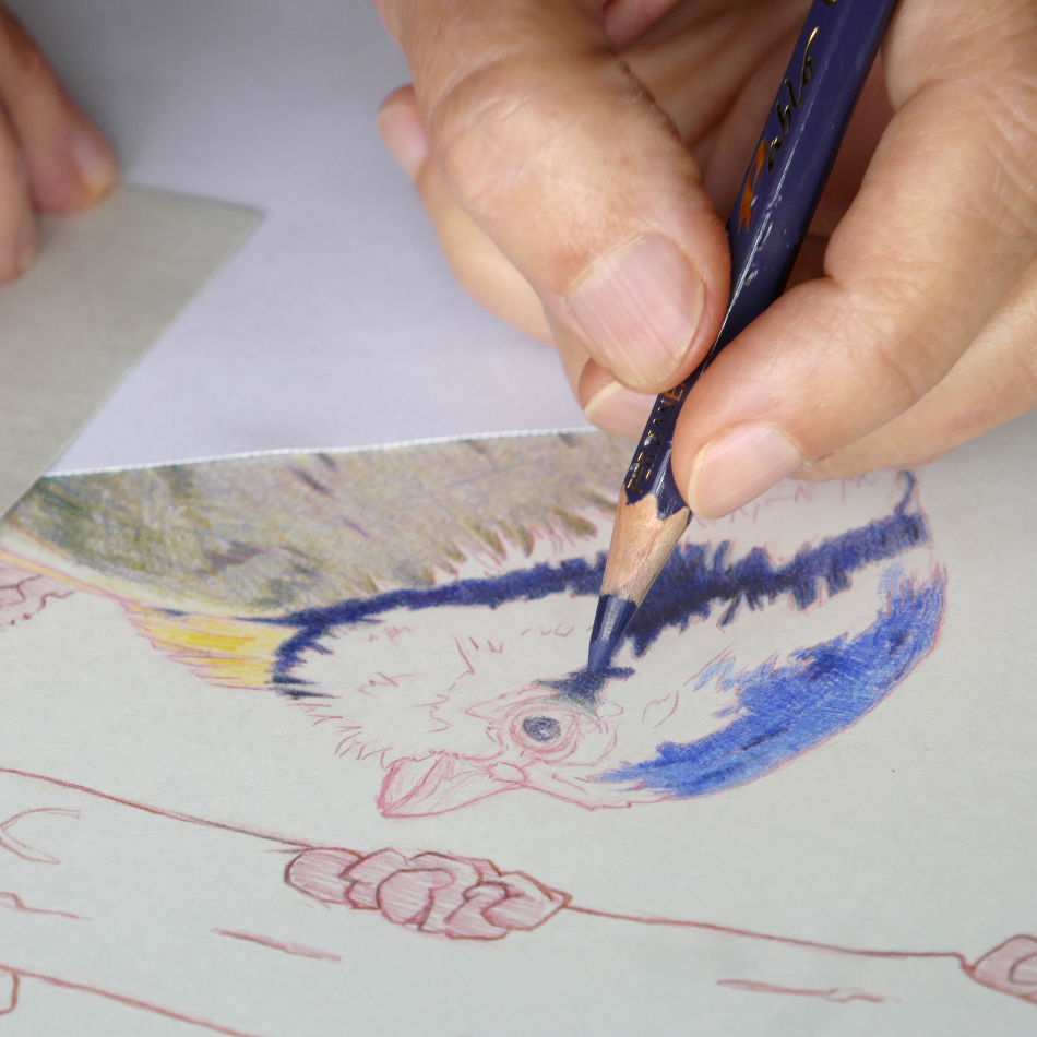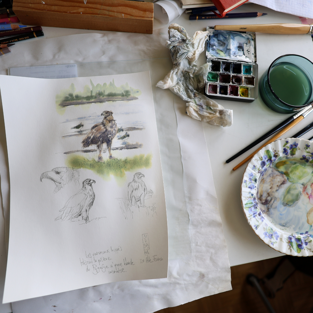 Oiseaux sauvages, observés en nature, dessinés sur place au crayon gris et crayons de couleur. MIse en couleur à l'aquarelle souvent réalisée après-coup, à l'atelier.