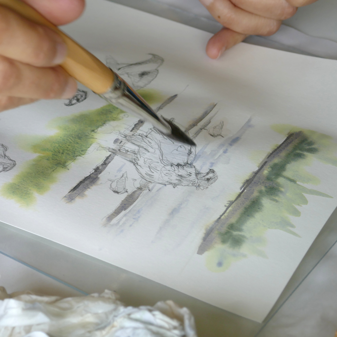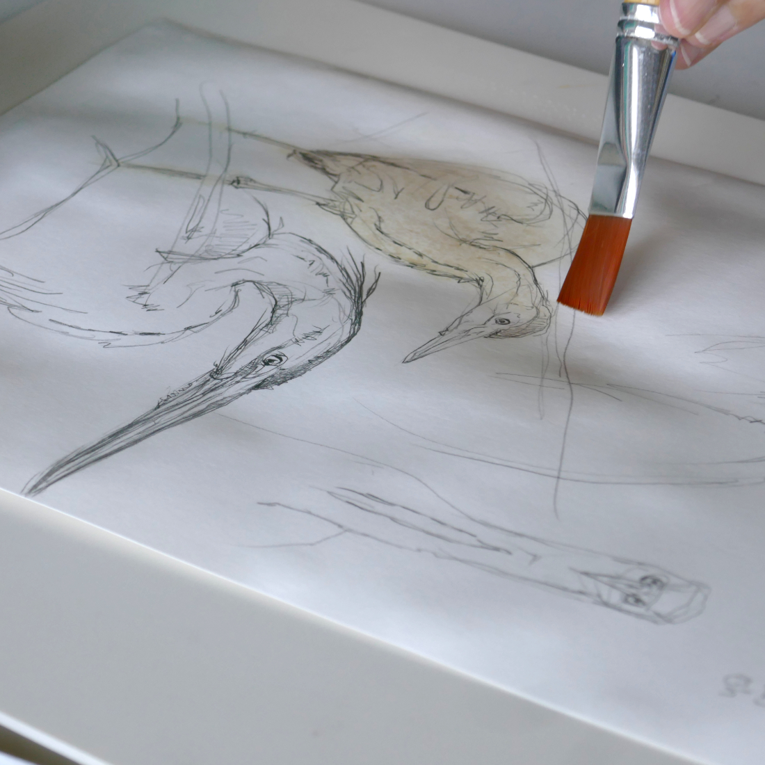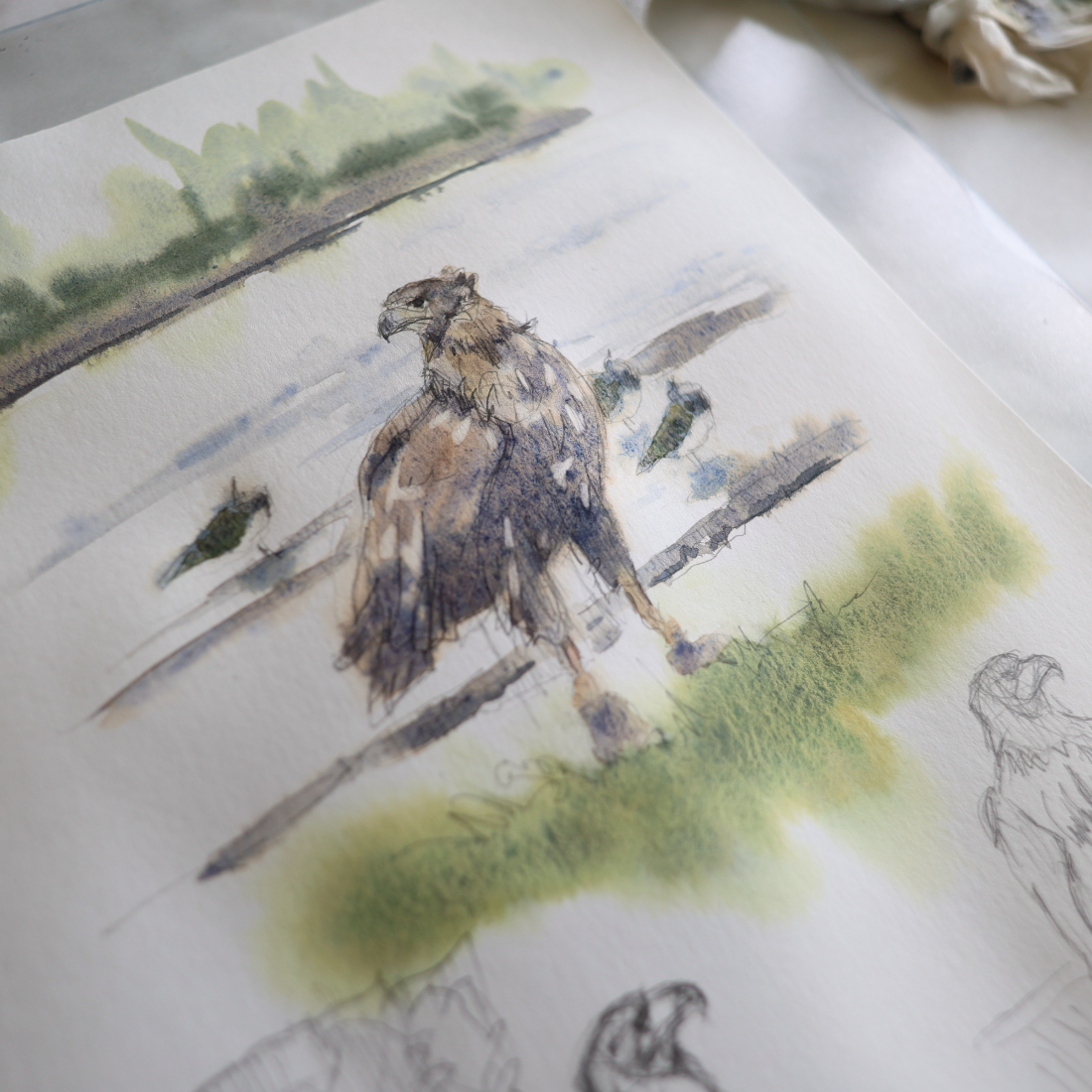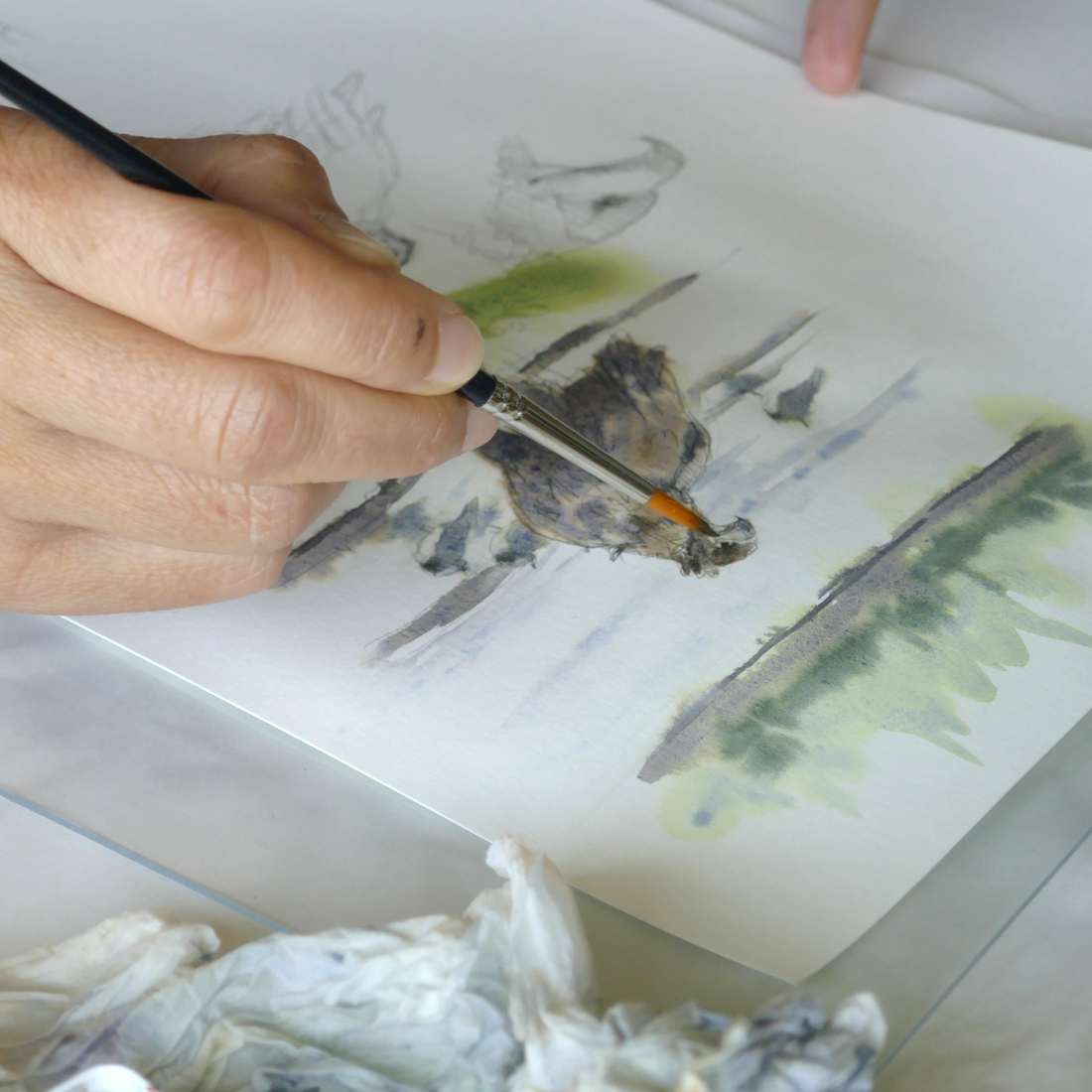 Oiseaux sauvages, observés en nature, dessinés sur place au crayon gris et crayons de couleur. MIse en couleur à l'aquarelle souvent réalisée après-coup, à l'atelier.