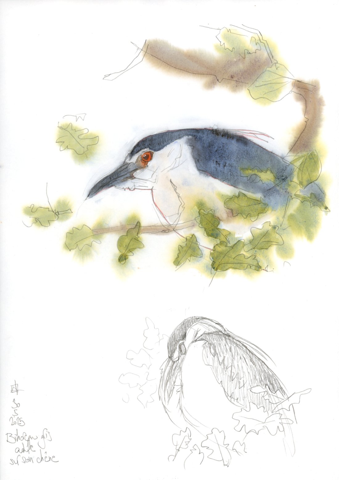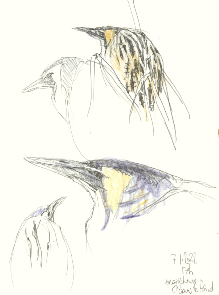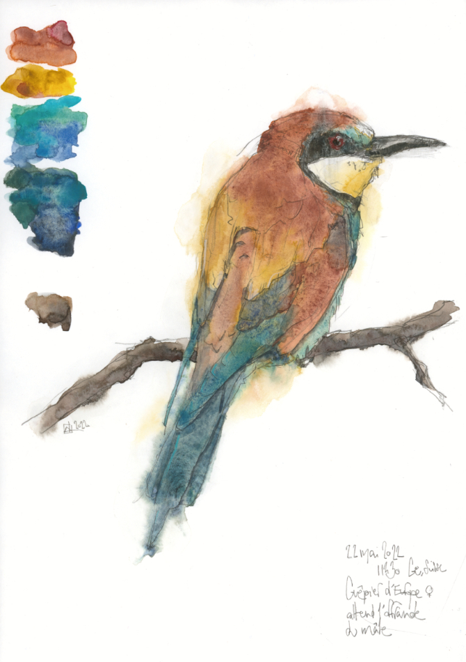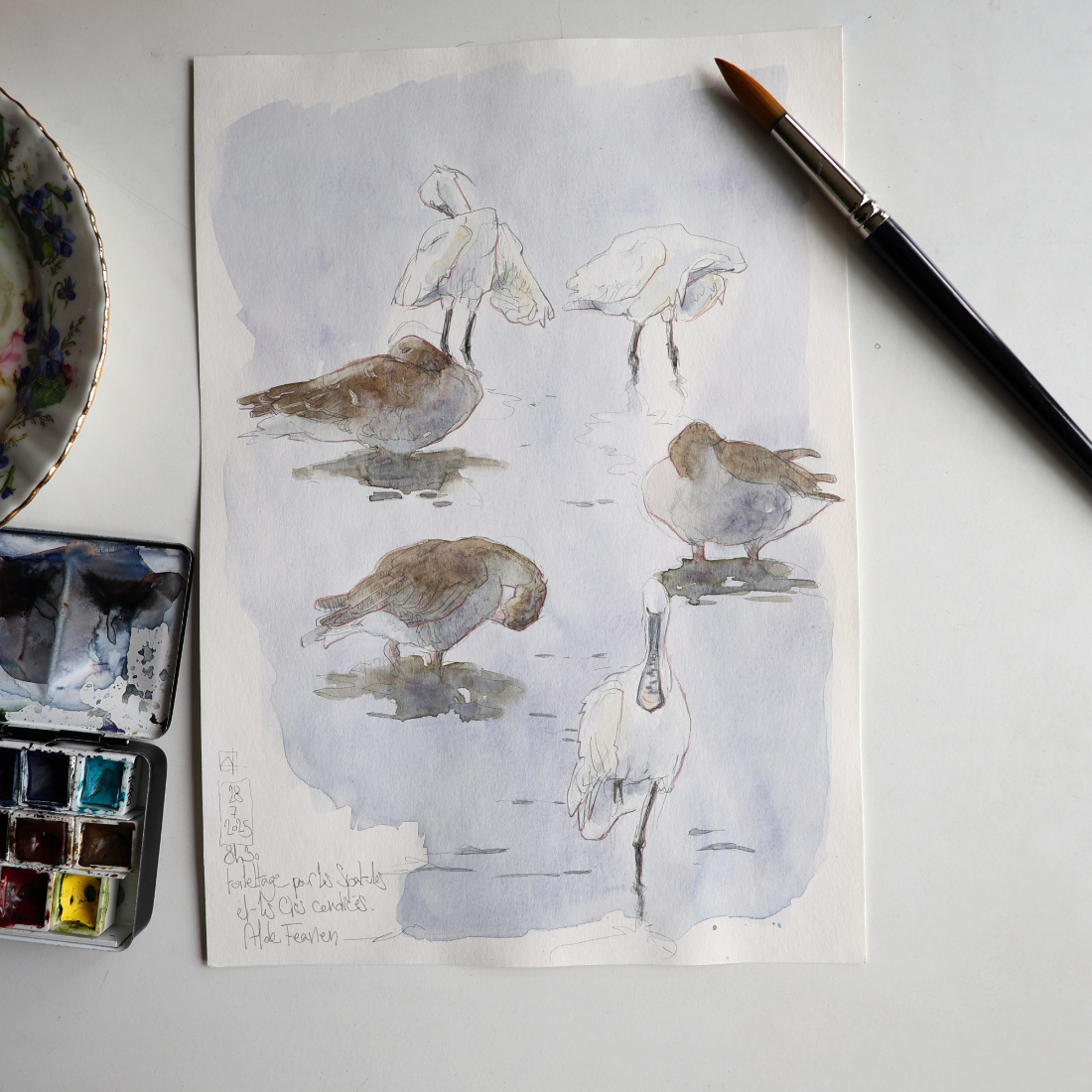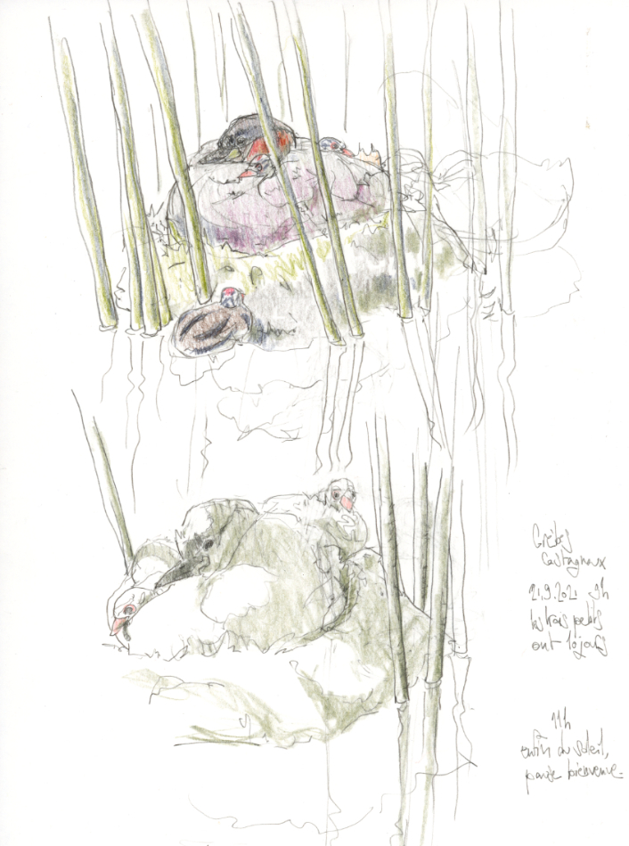 Oiseaux sauvages, observés en nature. Ci-dessous une série dessinés au crayon de couleur, d’après mes photos faites sur place.