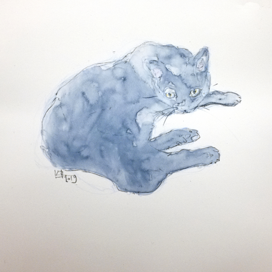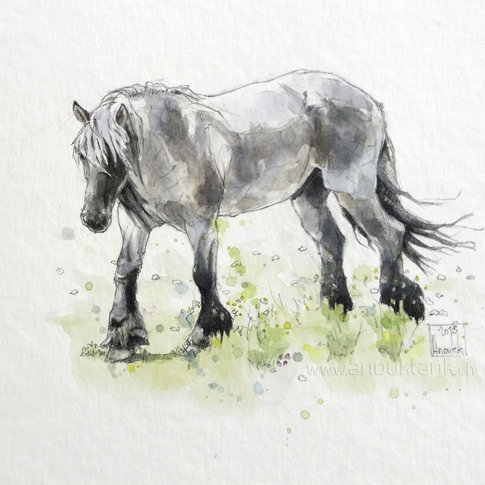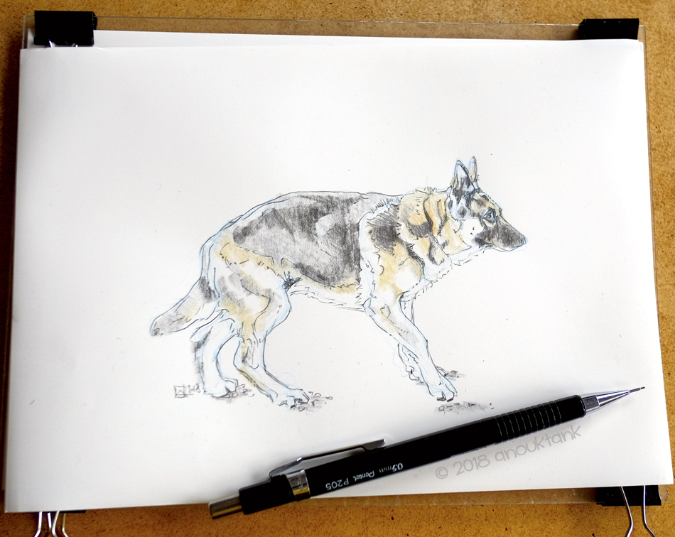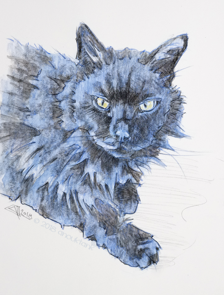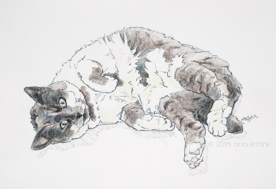Crayon gris et crayons de couleur aquarelle, sur papier.