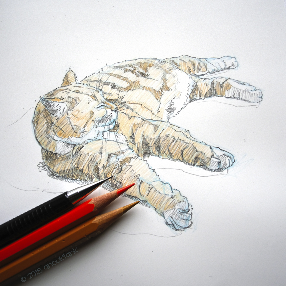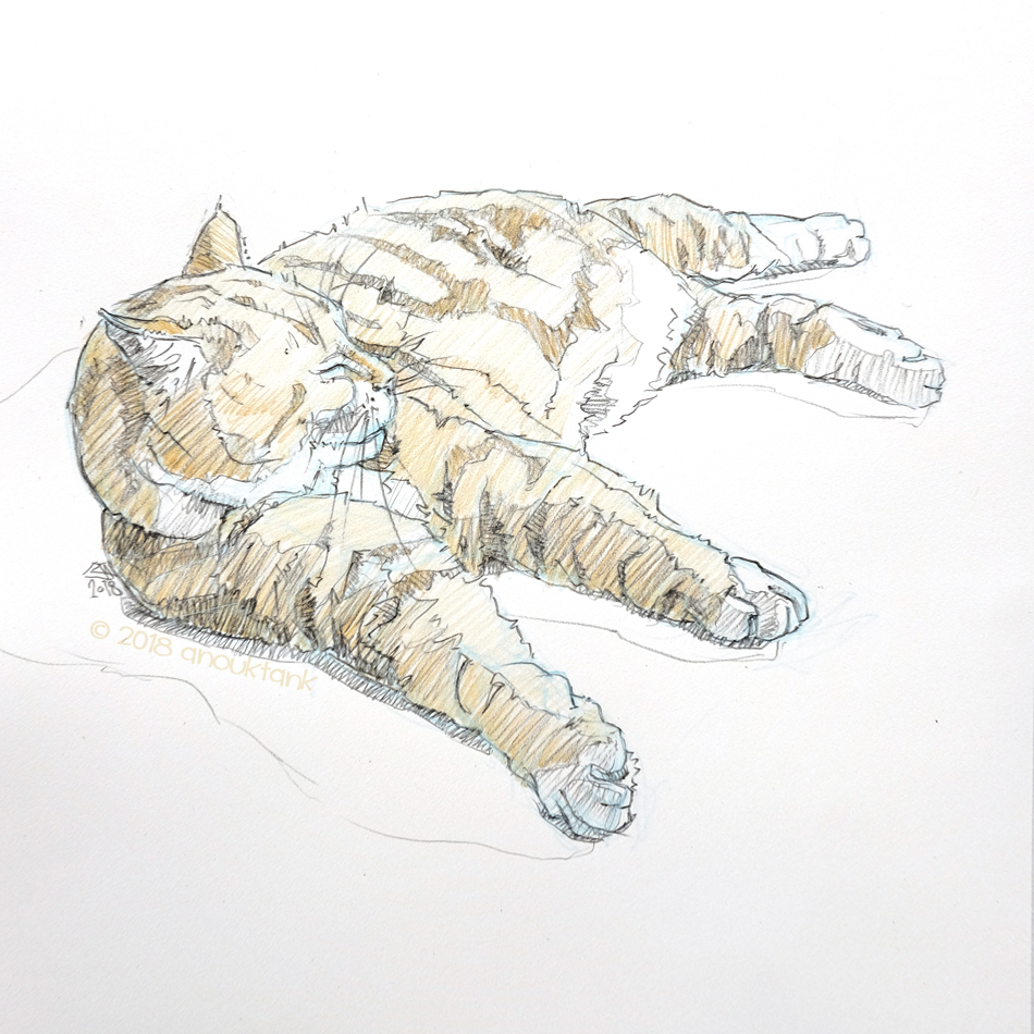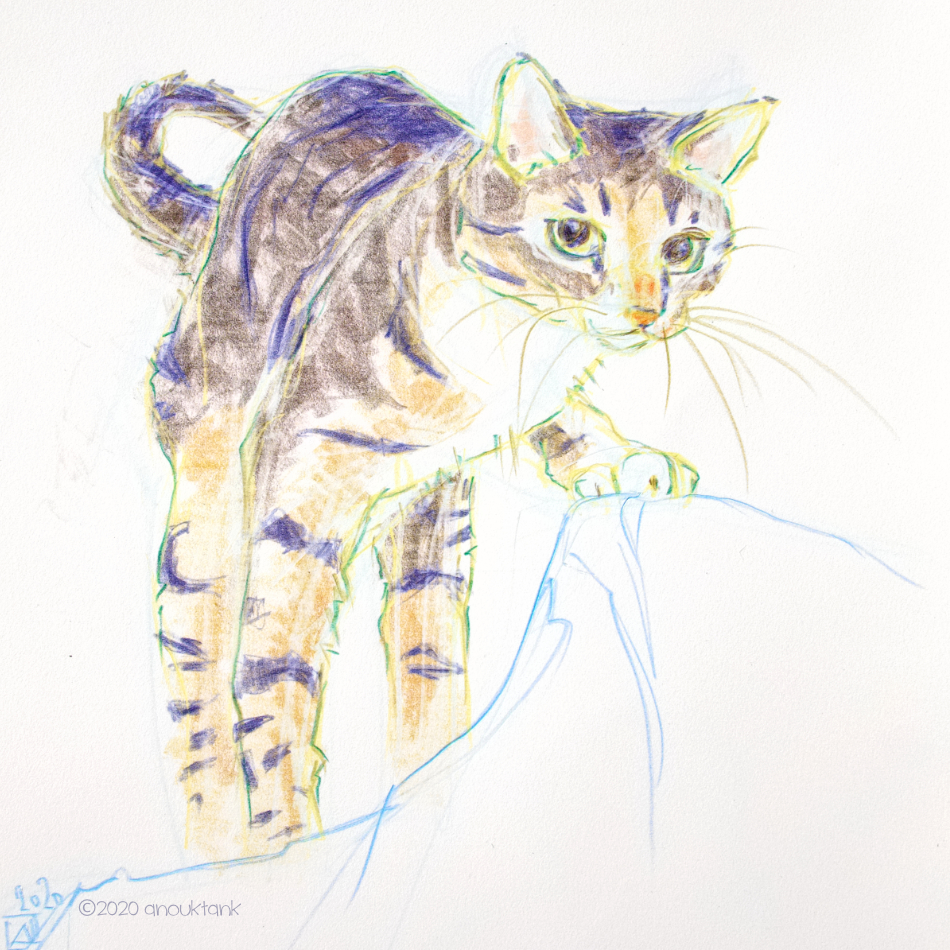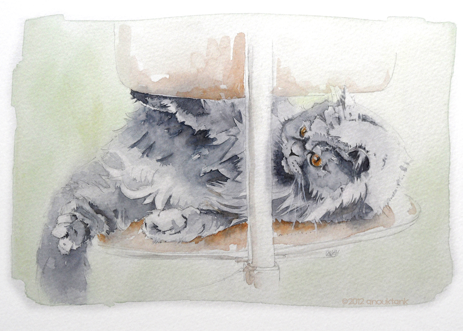 Crayon gris et crayons de couleur aquarelle, sur papier.