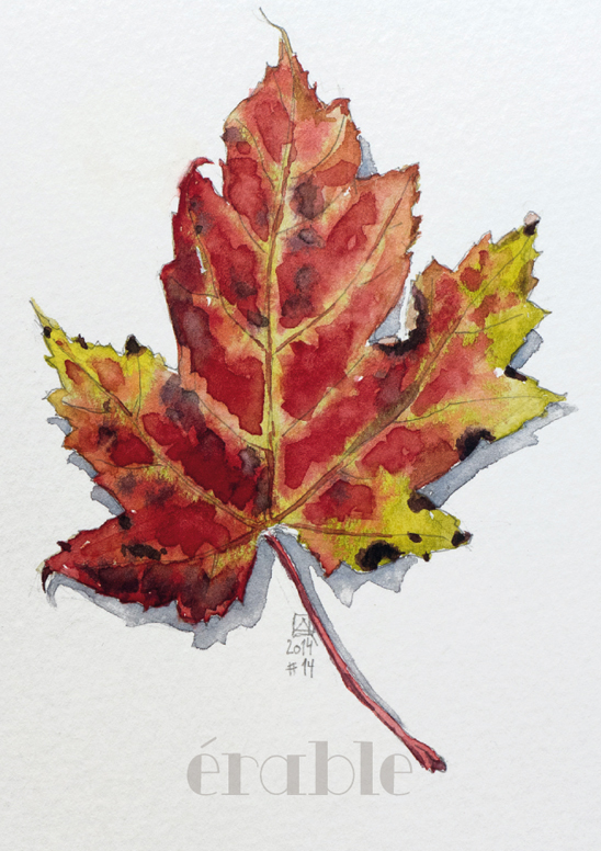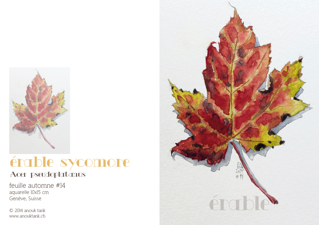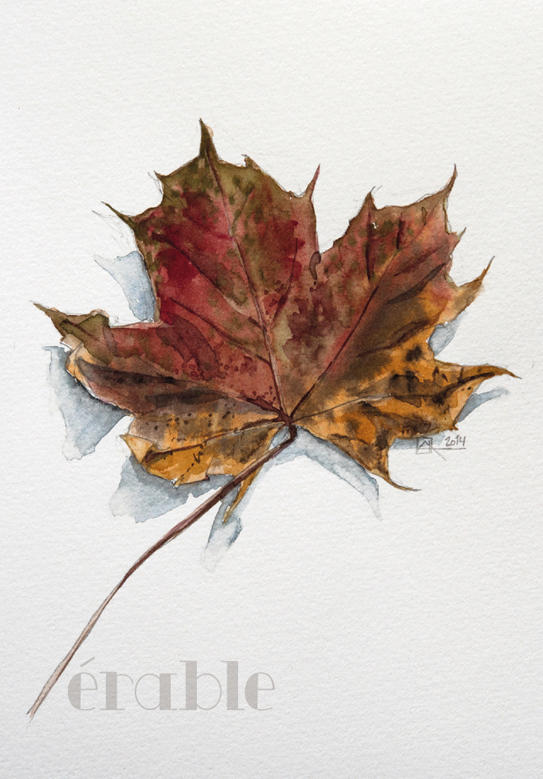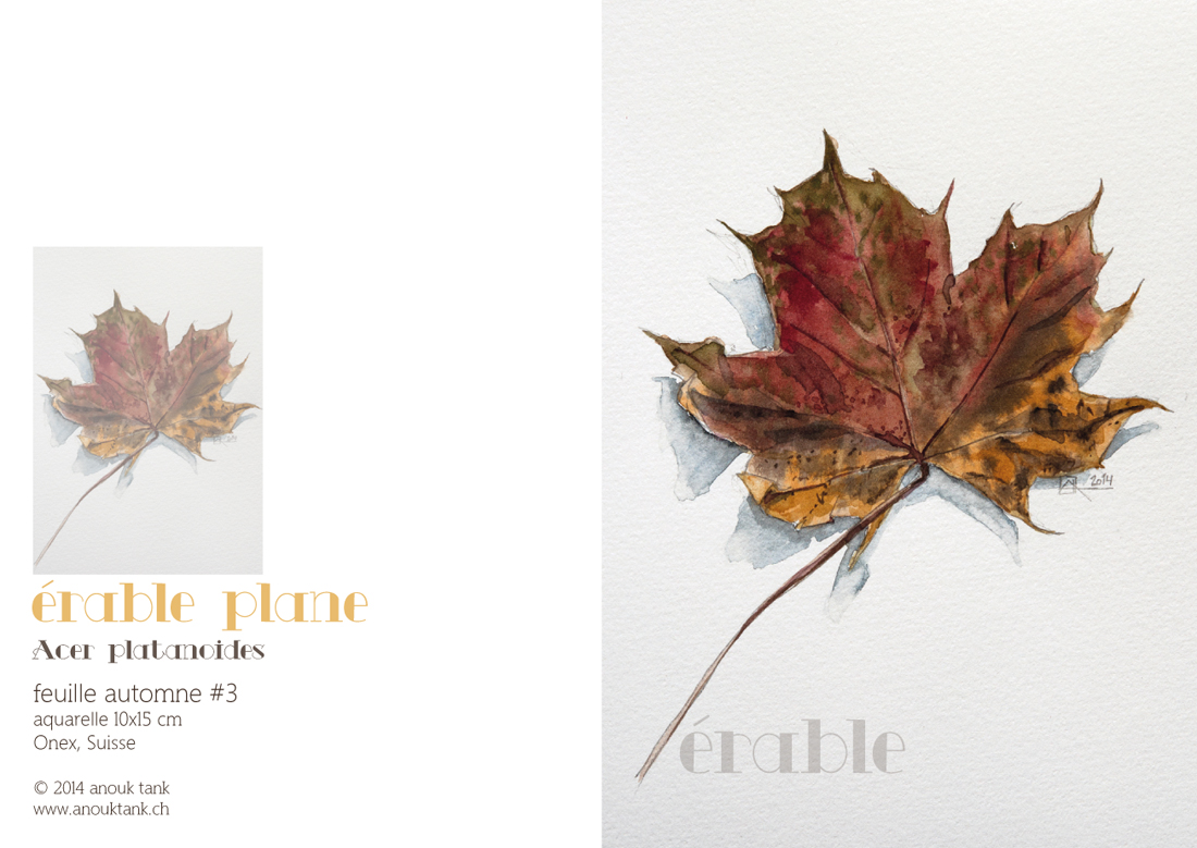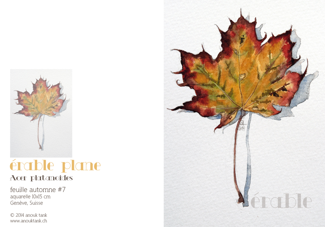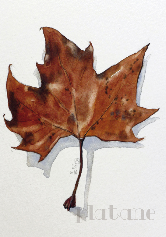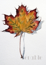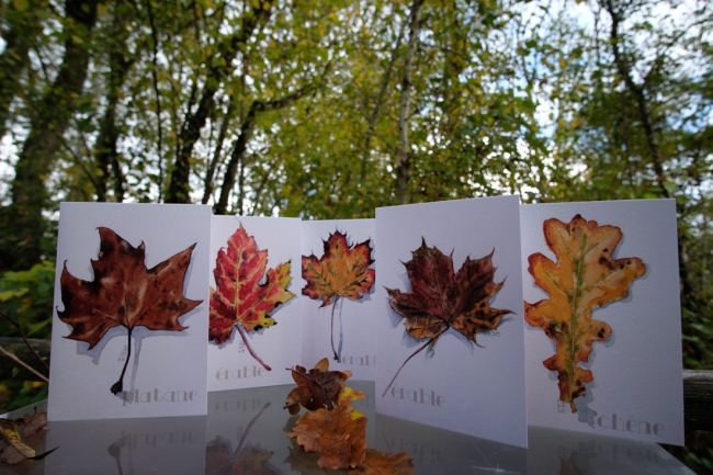 Je les ai donc conservées dans le sac sur le balcon, au frais et dans l'humidité, afin que le processus de coloration continue. J'en sortais une, et le jeu était que je réalisais une aquarelle de ma feuille avant qu'elle ne sèche complètement, devienne mat et terne, et se déforme. Petit à petit les aquarelles se sont multipliées... et c'est ainsi que j'ai eu l'idée d'en faire des cartes de voeux. Ma première série.