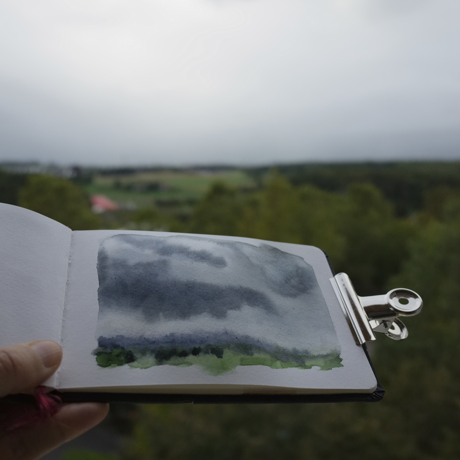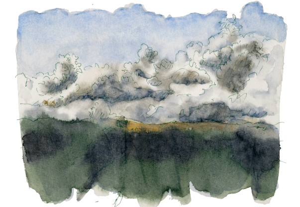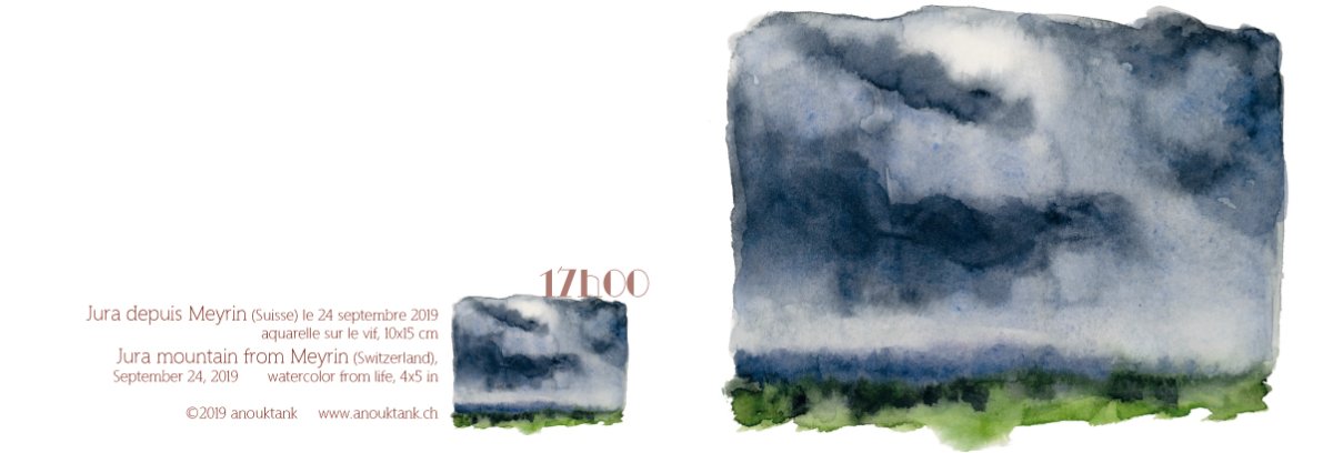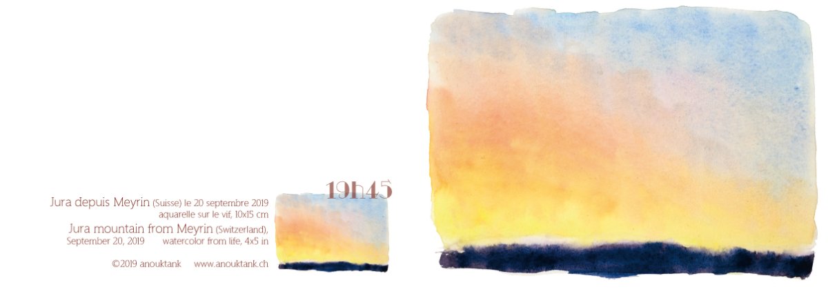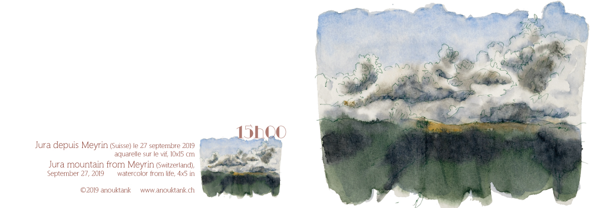 Extraits d’une série de 24 aquarelles de 10x15cm réalisées sur le vif durant le mois de septembre 2019. Le même endroit, à des heures et des lumières différentes.
