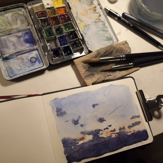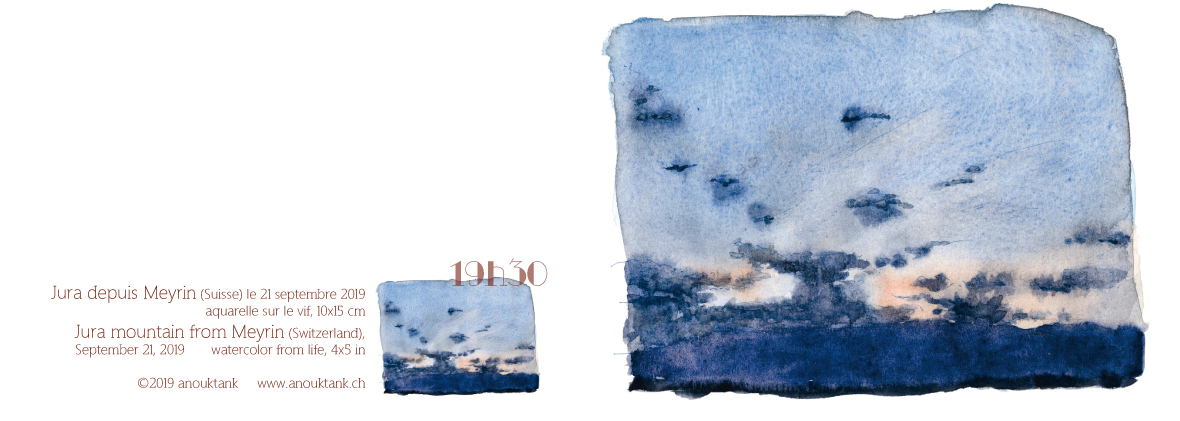 Extraits d’une série de 24 aquarelles de 10x15cm réalisées sur le vif durant le mois de septembre 2019. Le même endroit, à des heures et des lumières différentes.