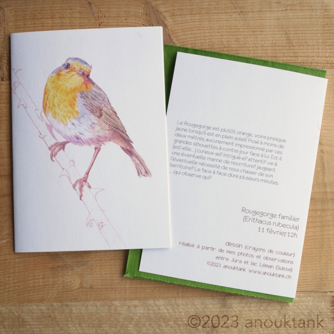 Le Rougegorge est plutôt orange, voire presque jaune lorsqu’il est en plein soleil! Posé à moins de deux mètres, aucunement impressionné par ces grandes silhouettes à contre-jour face à lui. Est-il (est-elle...) curieux-se? intrigué-e? attentif-ve à une éventuelle manne de nourriture? jaugeant l’éventuelle nécessité de nous chasser de son territoire? Le face à face dure plusieurs minutes. ... qui observe qui?