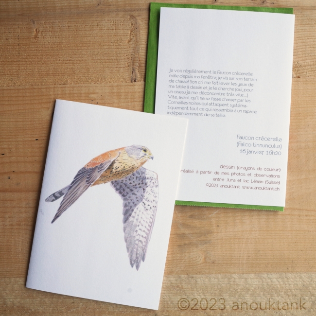 Je vois régulièrement le Faucon crécerelle mâle depuis ma fenêtre; je vis sur son terrain de chasse! Son cri me fait lever les yeux de ma table à dessin et je le cherche (oui, pour un oiseau je me déconcentre très vite...) Vite, avant qu’il ne se fasse chasser par les Corneilles noires qui attaquent systématiquement tout ce qui ressemble à un rapace, indépendamment de sa taille.