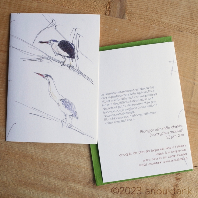 J'observe les oiseaux sauvages et les dessine sur place, à la longue-vue, ou je les prends en photo et les dessine après-coup, à l'atelier. Dans tous les cas, ce sont des rencontres et des aventures.
