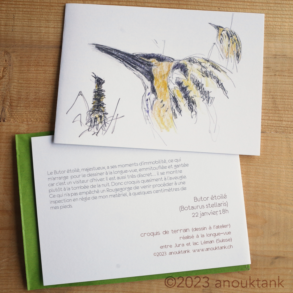 Le Butor étoilé, majestueux, a ses moments d’immobilité, ce qui m’arrange pour le dessiner à la longue-vue, emmitouflée et gantée car c’est un visiteur d’hiver. Il est aussi très discret... il se montre plutôt à la tombée de la nuit. Donc croquis quasiment à l’aveugle. Ce qui n’a pas empêché un Rougegorge de venir procéder à une inspection en règle de mon matériel, à quelques centimètres de mes pieds.