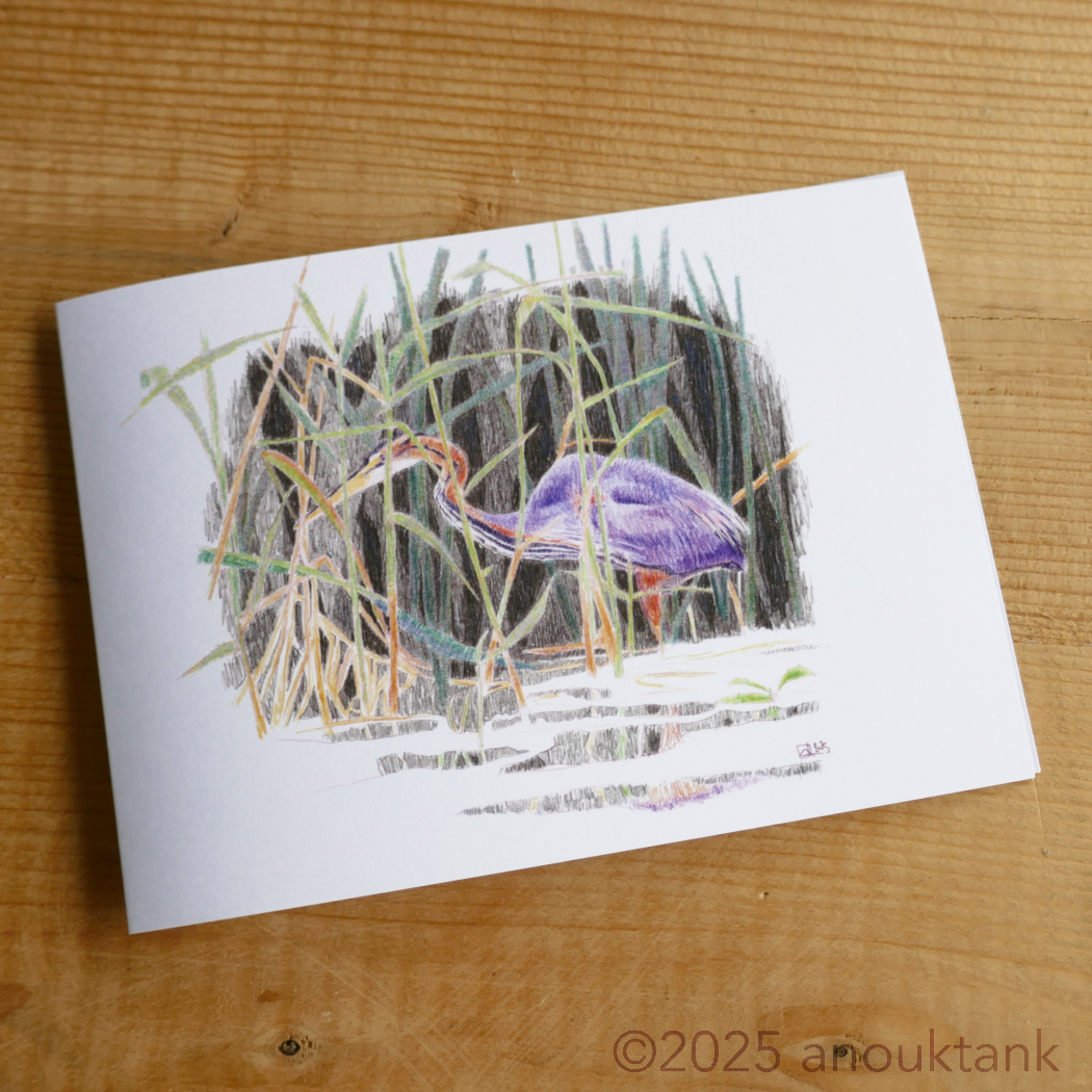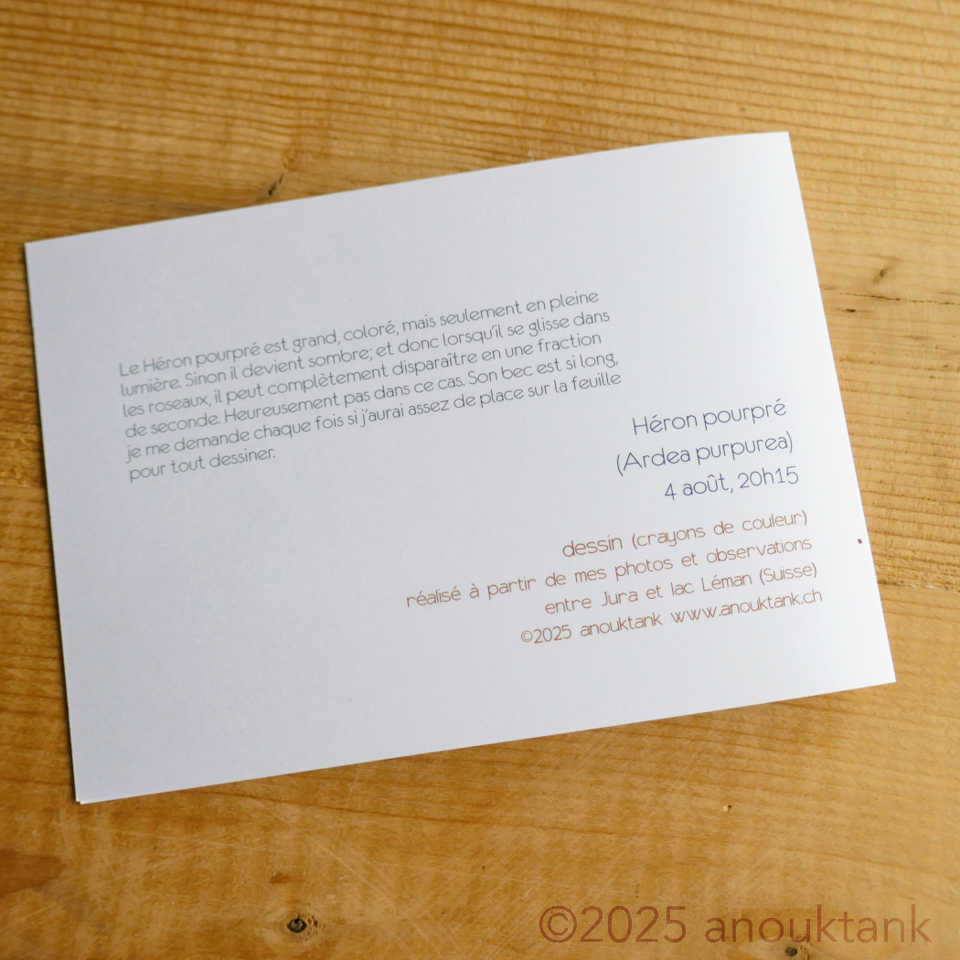 Le Héron pourpré est grand, coloré, mais seulement en pleine lumière. Sinon il devient sombre; et donc lorsqu’il se glisse dans les roseaux, il peut complètement disparaître en une fraction de seconde. Heureusement pas dans ce cas. Son bec est si long, je me demande chaque fois si j’aurai assez de place sur la feuille pour tout dessiner.