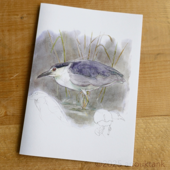 Plutôt actif la nuit, les heures diurnes passées à observer ce héron peu connu ont été précieuses. Chassant à l’affût, immobile de longues minutes, le Bihoreau gris (ici un adulte) se prête bien au dessin réalisé sur place, à la longue-vue.