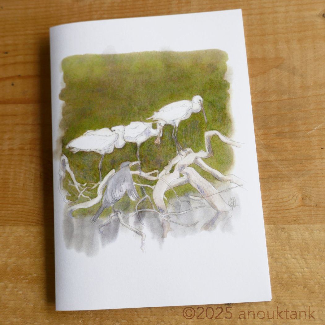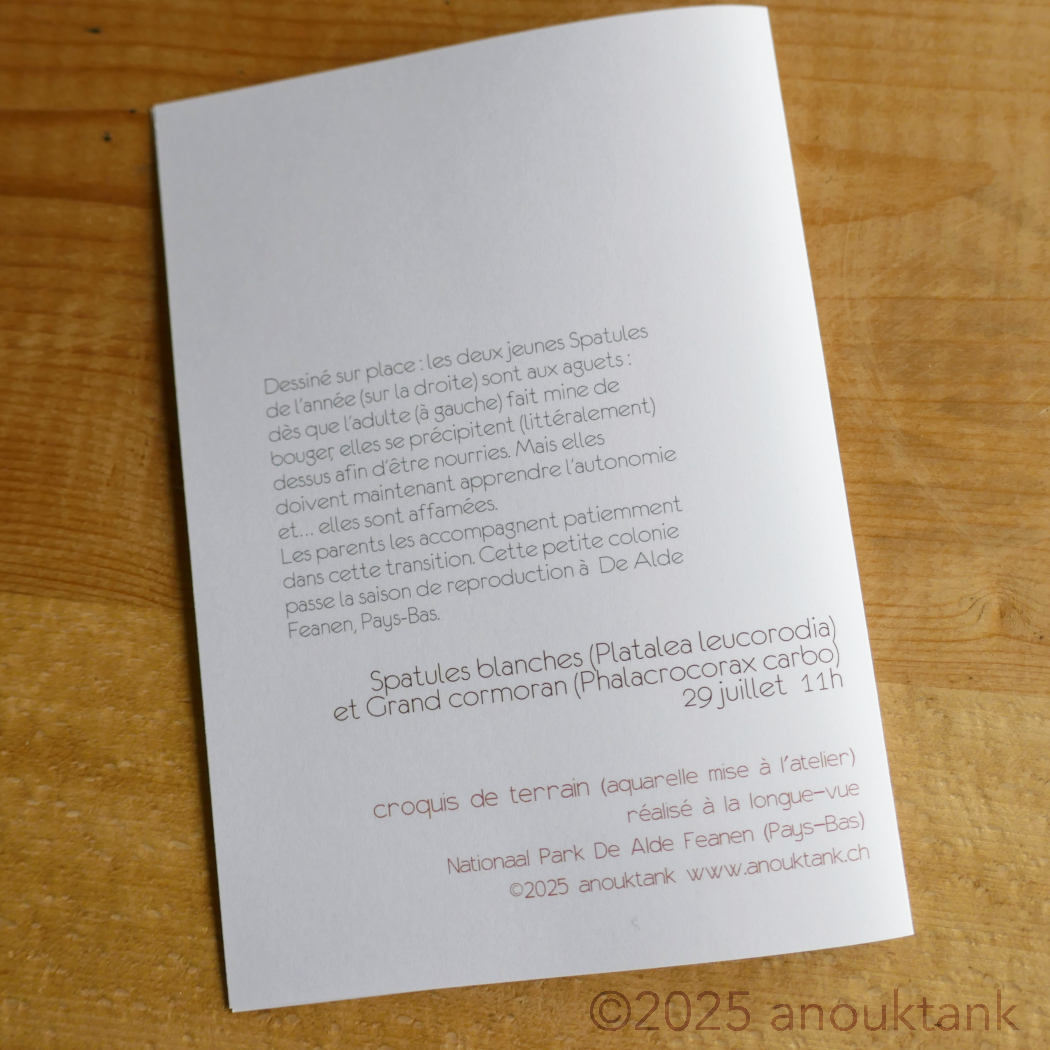 Dessiné sur place : les deux jeunes Spatules de l’année (sur la droite) sont aux aguets : dès que l’adulte (à gauche) fait mine de bouger, elles se précipitent (littéralement) dessus afin d’être nourries. Mais elles doivent maintenant apprendre l’autonomie et... elles sont affamées.